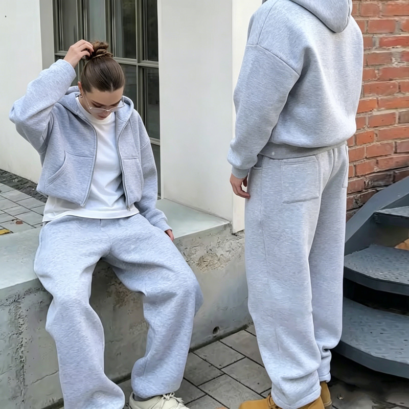 - Crafted from thick, fleece-lined cotton-blend fabric, the set delivers a plush, cozy feel against the skin while remaining breathable, perfect for lounging, running errands, or casual outings.